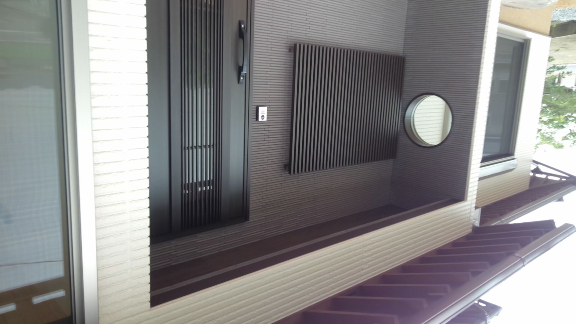 ・壁はボーダータイル張り、おしゃれな丸窓FIX/軒天タルキはダーク色塗り仕上、軒天も杉無垢板にダーク色塗り仕上