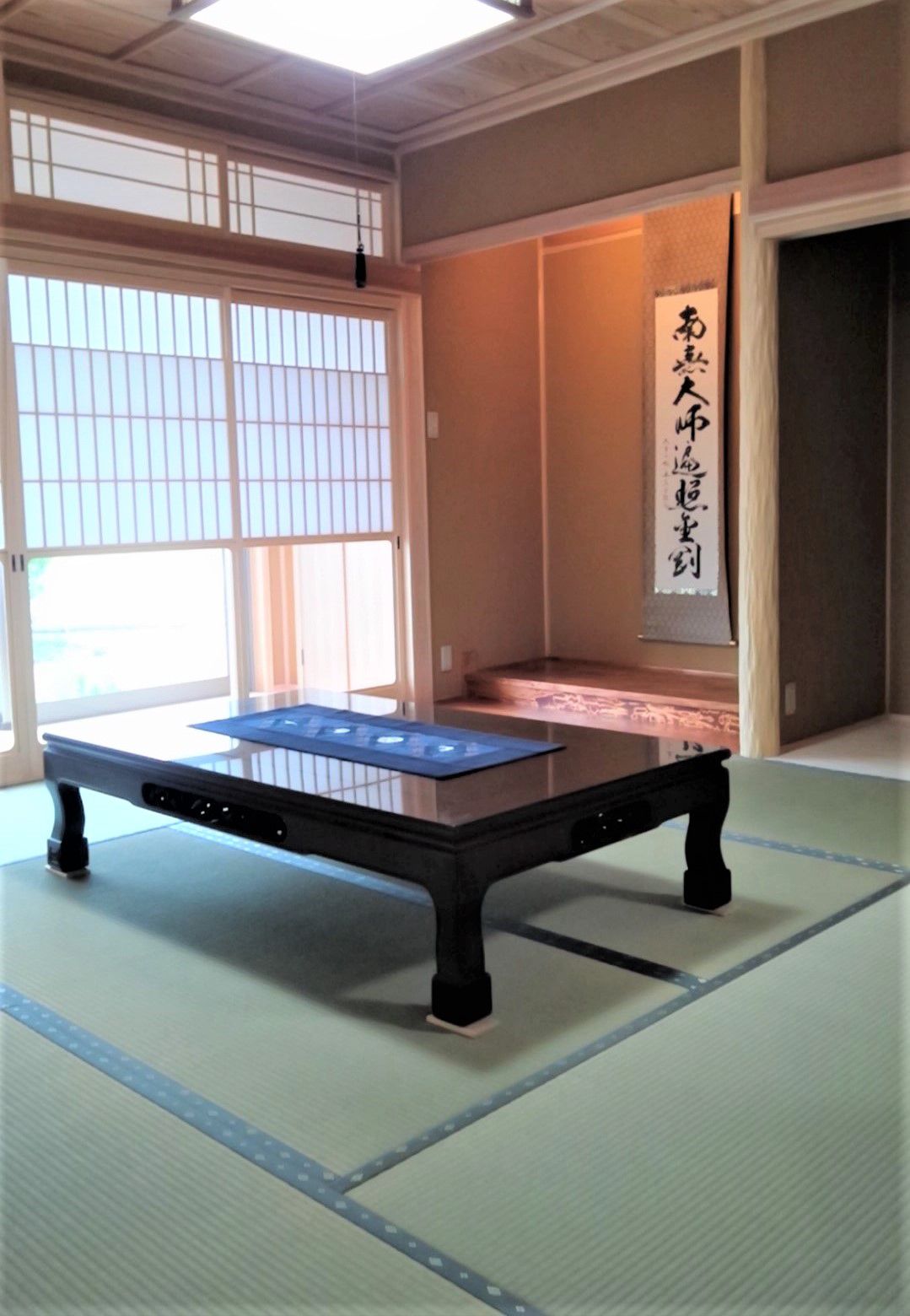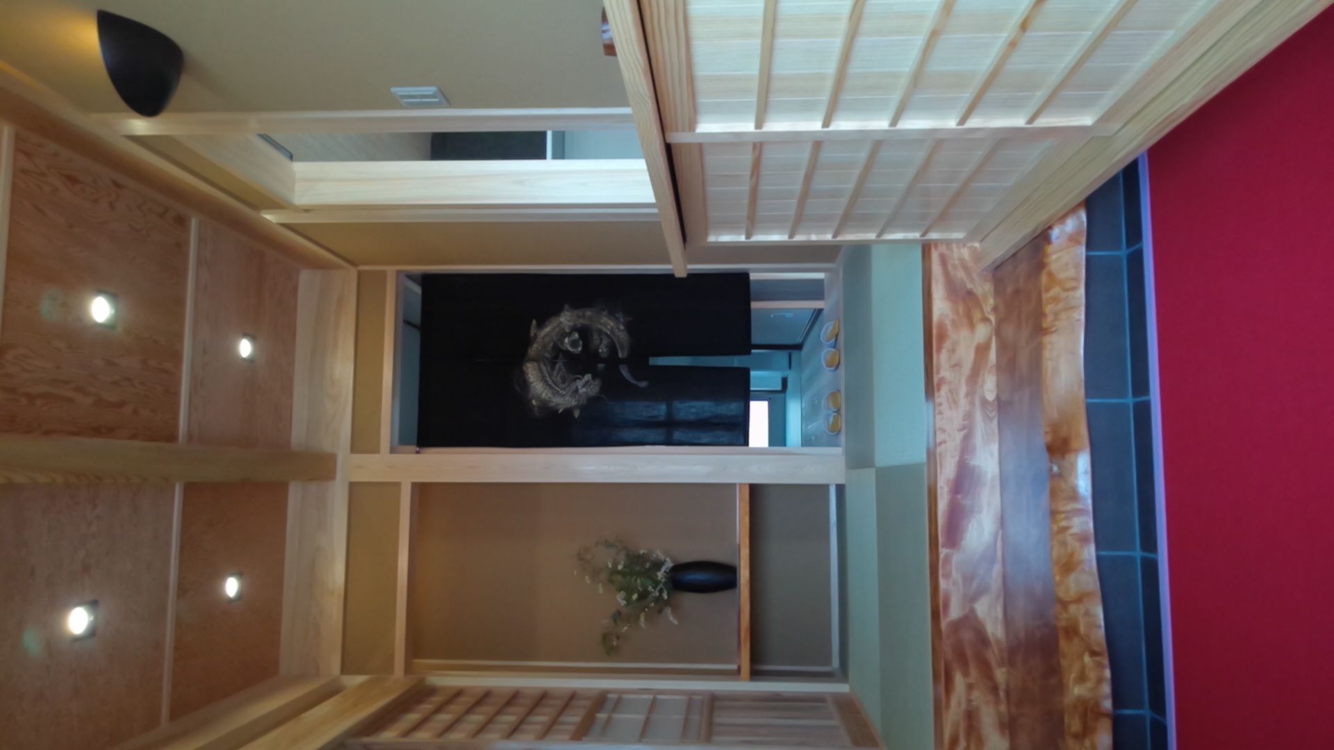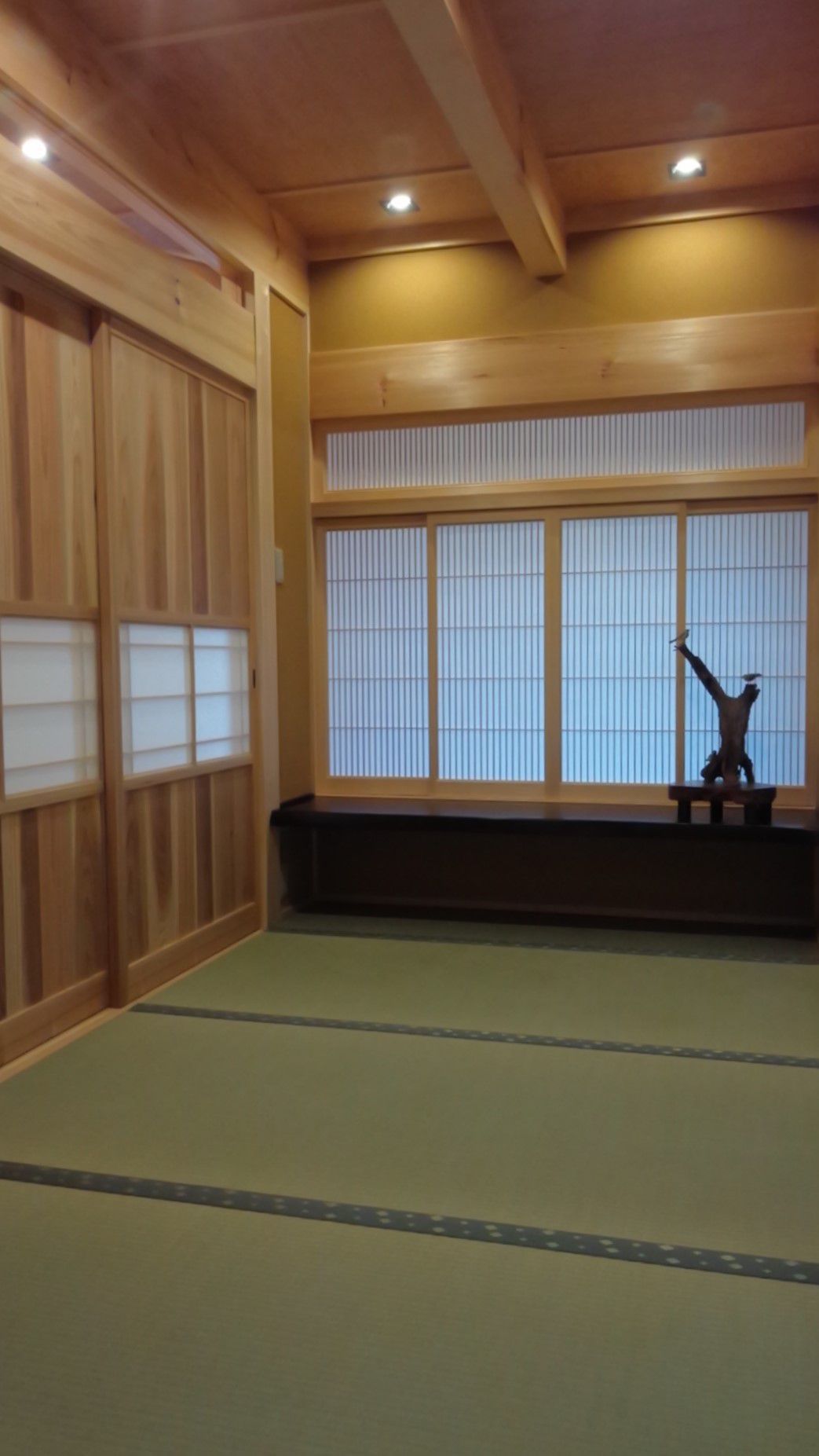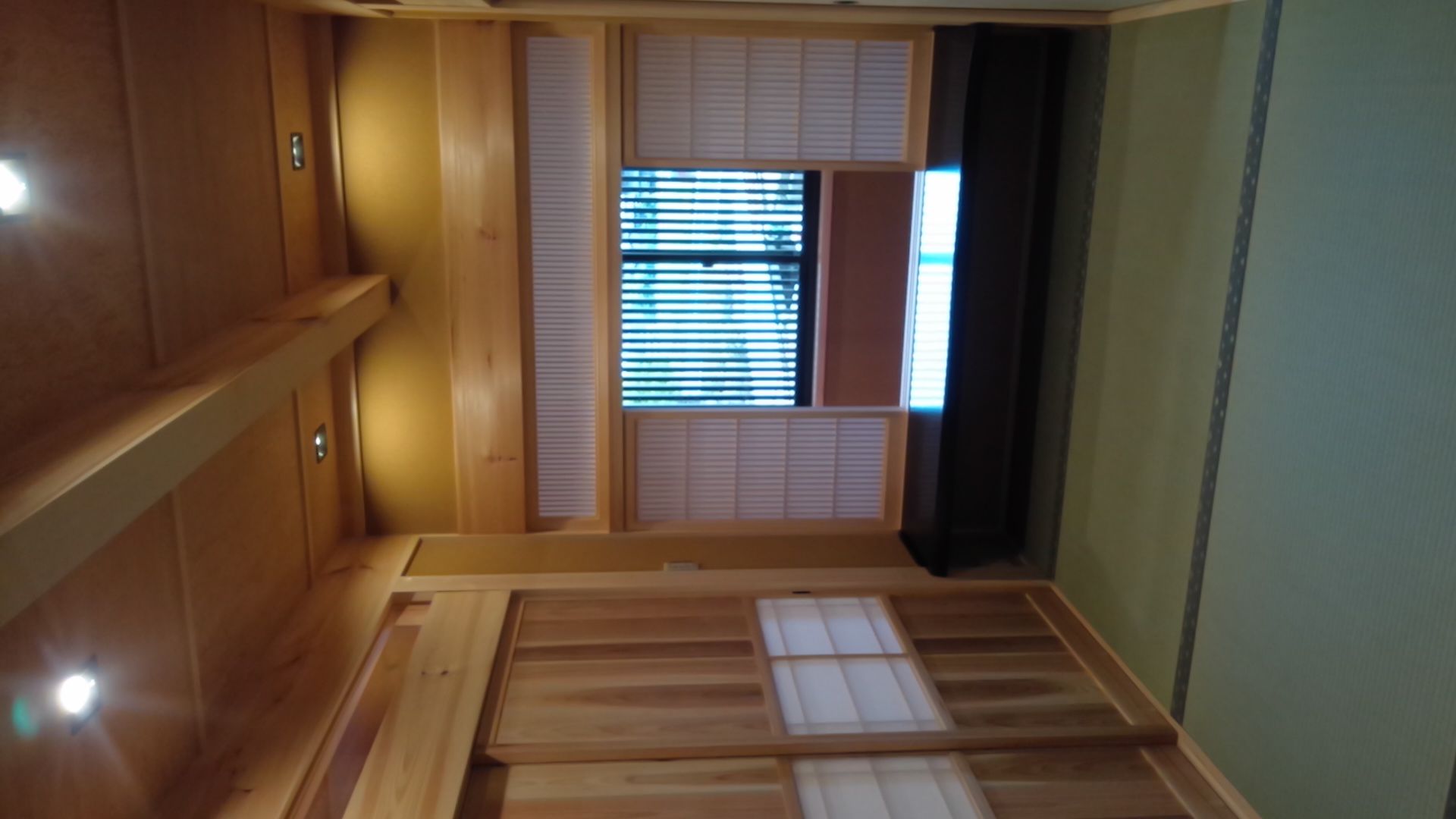 ・床は熊本産イ草の畳(市松敷き)/壁は桧4寸真壁現わしの上、わらじゅらく塗り/天井は地松大引現わし天井、差し鴨居も地松化粧
