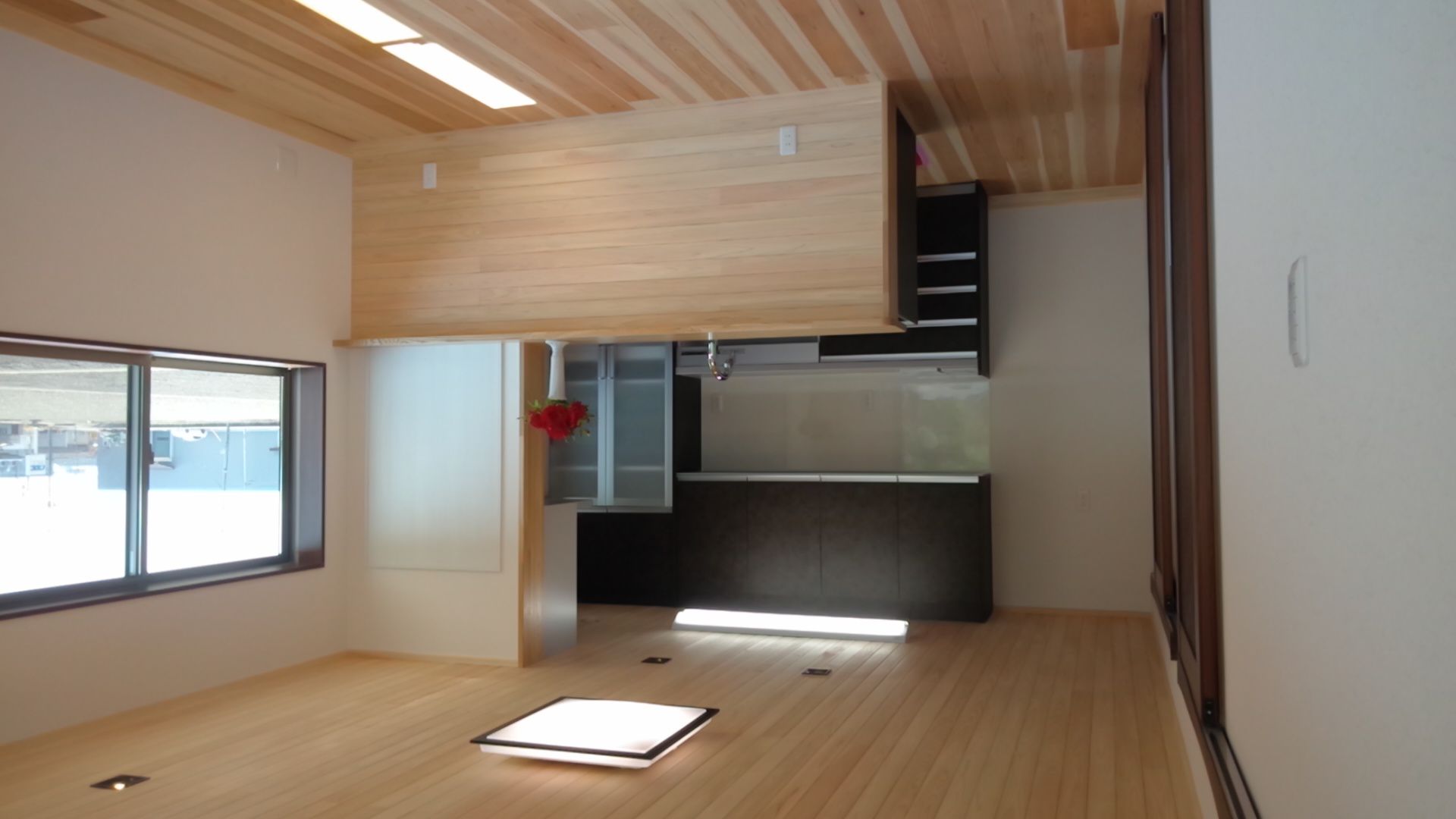 ・床は杉無垢(厚さ30㎜)上小節、無塗装、本実張り、天井は桧上節小幅板、相沢り張り、カウンター壁も同じく