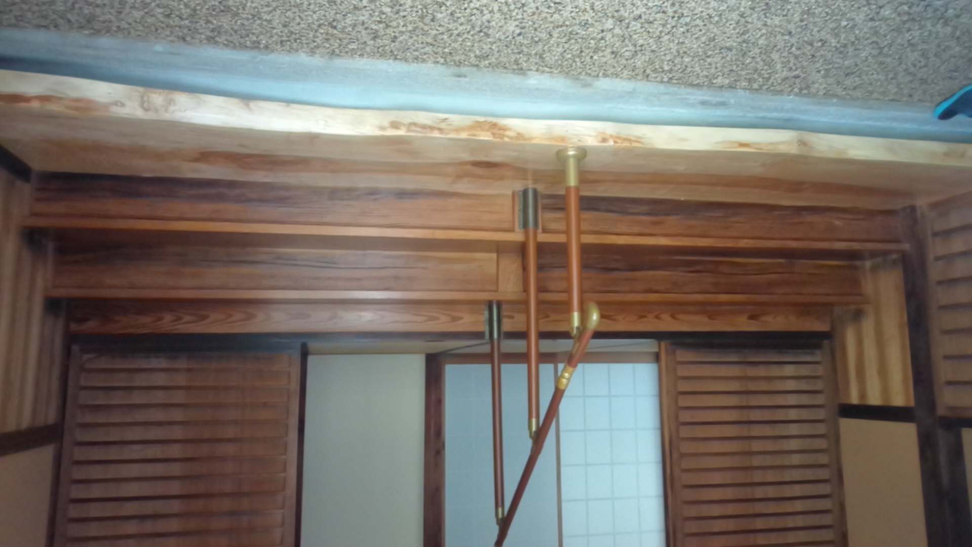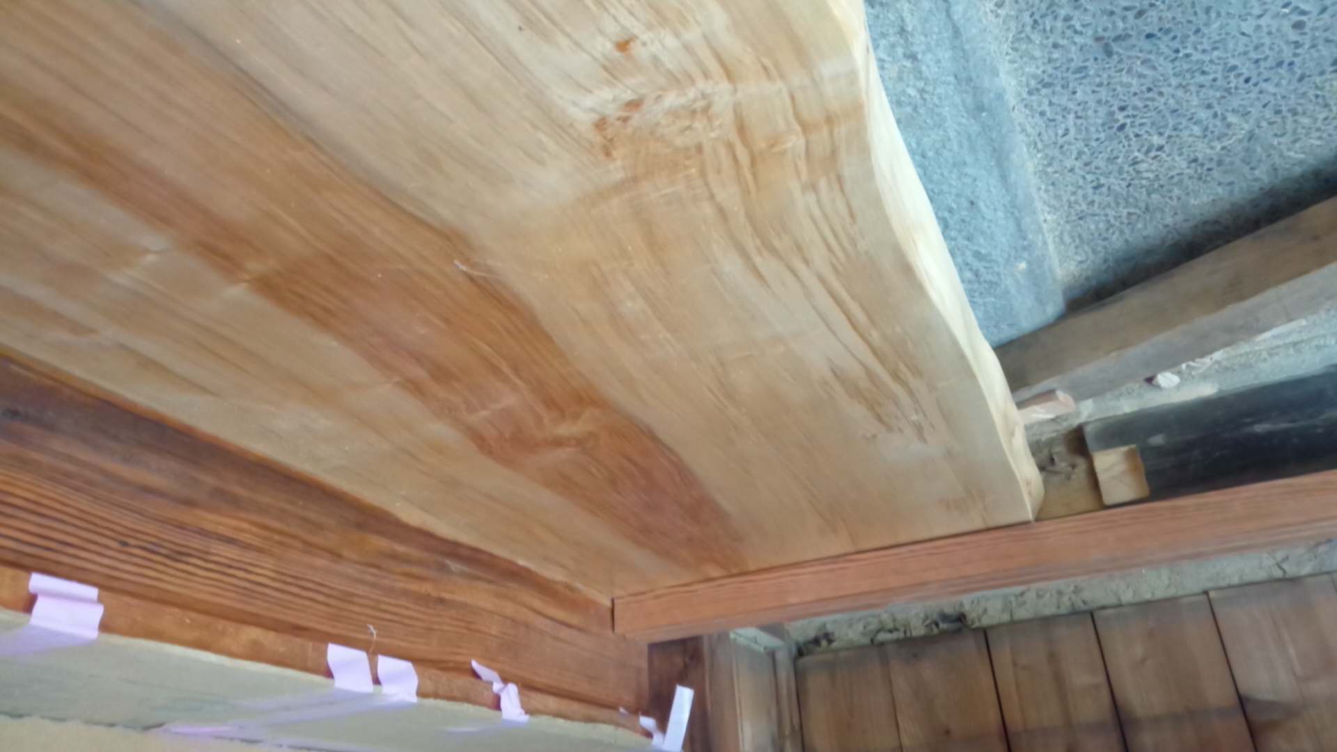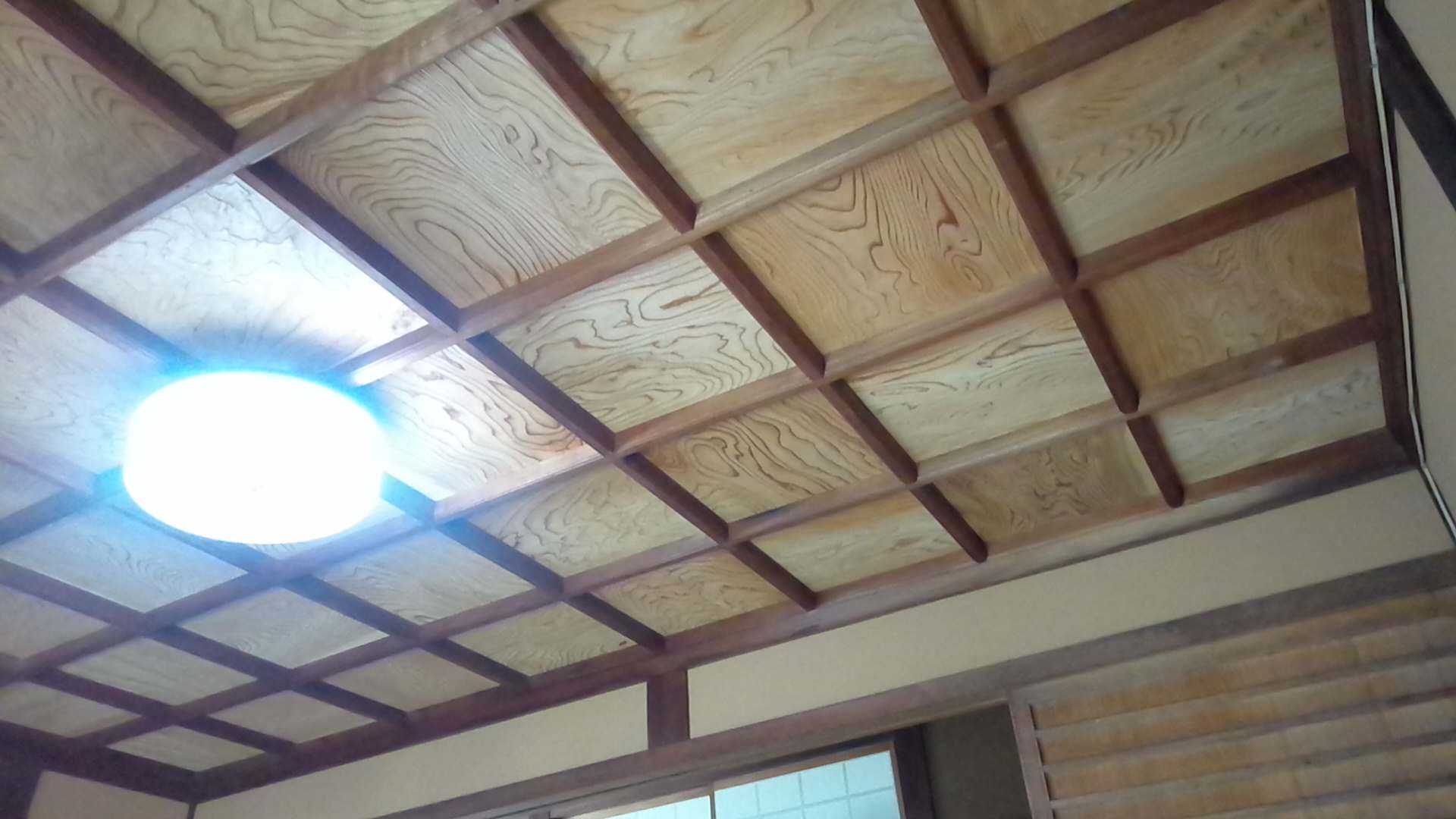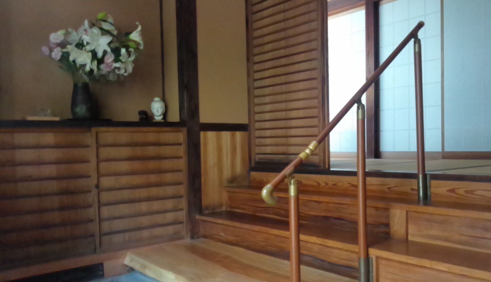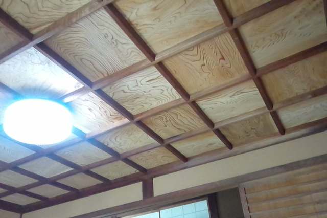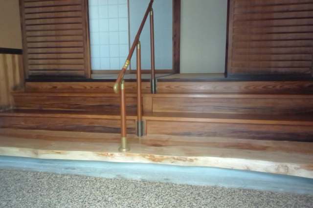 昭和初期の家、雨漏りにより天井、框が腐っており、やりかえを行う。框を撤去し、お洒落な式台(栃無垢、耳付)に、天井は格天井、杉浮造り張りにリニューアル。壁はしっくいを落としてわら聚楽塗にしました。土間はリンクストーン塗にして全体の空間を素敵な雰囲気にしました。昔からそこにあるような自然感を生み出した秀作となっています。